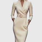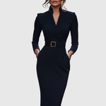 Dieses Kleid zeichnet sich durch einen raffinierten Mock-Wrap-Ausschnitt, Dreiviertelärmel und eine schlanke Bleistift-Silhouette aus. Ein strukturierter Gürtel mit quadrischer Schnalle betont die Taille. Der taillierte Schnitt folgt den natürlichen Kurven und bietet gleichzeitig klare, glatte Linien. Subtile Schulterstrukturen und seitliche Taschen fügen Funktionalität hinzu, ohne auf Stil zu verzichten. Erhältlich in den Größen XS bis 2XL, ideal für jede Figur.