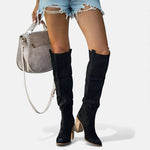 Damen kniehohe Stiefel aus braunem Wildleder, mit einem eleganten Design, das klassischen Westernstil mit modernen Linien verbindet. Der hohe Schaft umschließt das Bein und bietet Weiblichkeit und Raffinesse, während der stabile Absatz Höhe und Komfort gewährleistet.