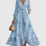 Maxikleid mit V-Ausschnitt, langen Ärmeln, weichen Falten und einem Gürtel in der Taille, der Form und Charme verleiht. Der ausgestellte Saum bietet eine romantische, feminine Silhouette, während das subtile, florale Muster einen raffinierten, zeitlosen Akzent setzt. Entworfen, um schön am Körper zu fallen, vereint dieses Kleid Eleganz mit Tragekomfort.